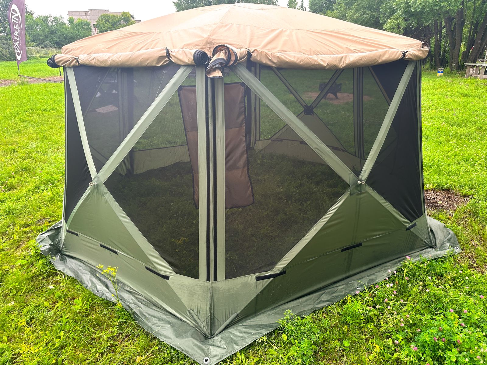 Стенки шатра могут быть закрыты полностью или открыты с москитной сеткой. Открываются по-отдельности. Молния на шторках смещена в сторону.