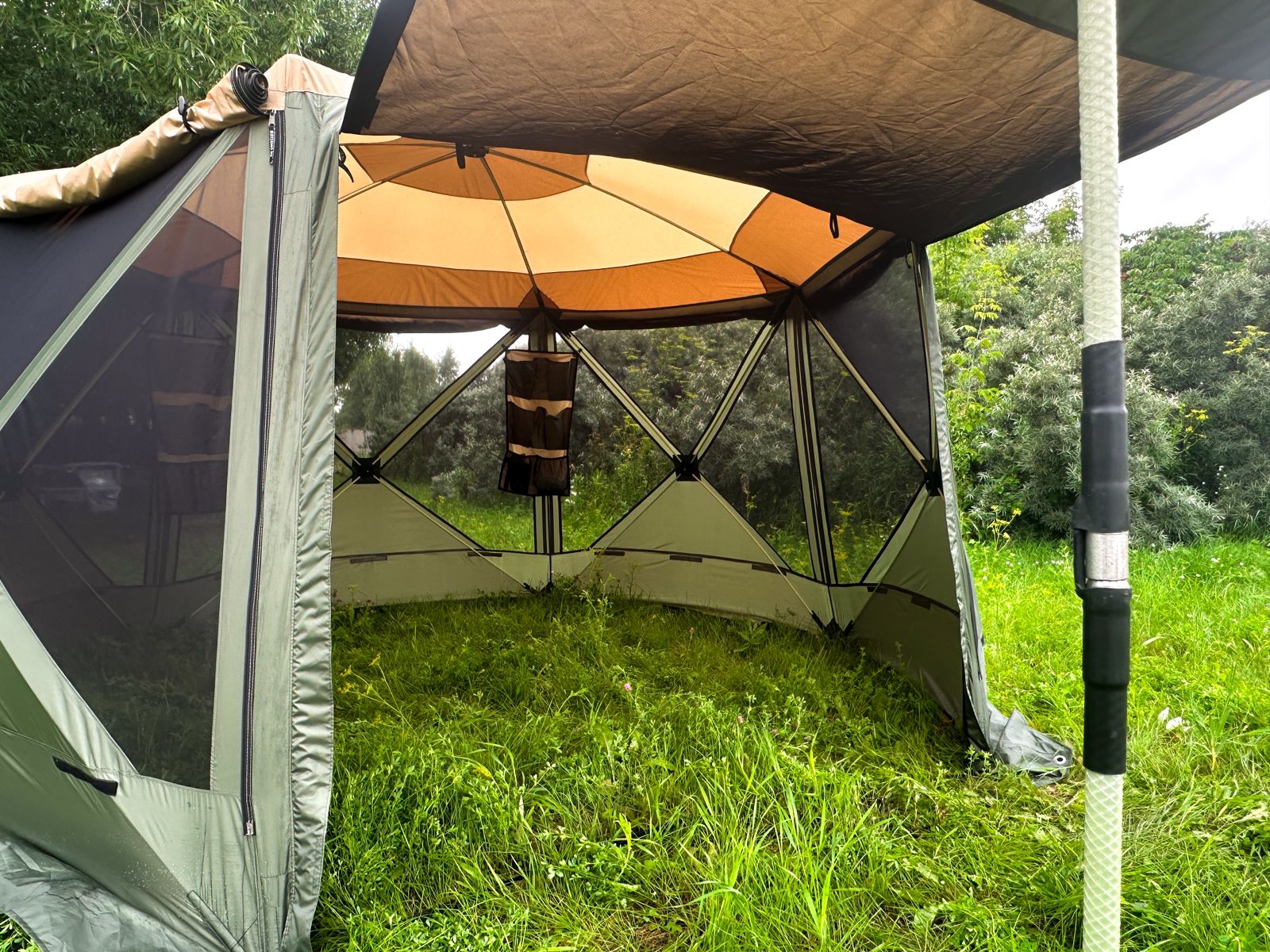Шатёр оборудован одним большим входом с москитной сеткой в пол. Внешняя ткань тента может использоваться как солнцезащитный козырек благодаря 2 упорам из стеклокомпозитного прутка 12мм которые идут в комплекте. Входная группа может быть закрыта полностью или с поднятым внешним тентом.